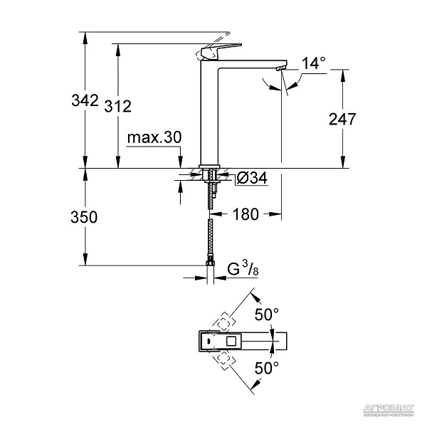 Довжина виливу 180 мм, висота змішувача 312 мм