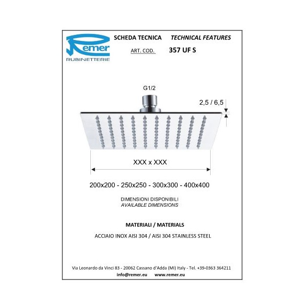 Remer Верхній душ квадрат полірована нержавійка 25*25 см, Італія