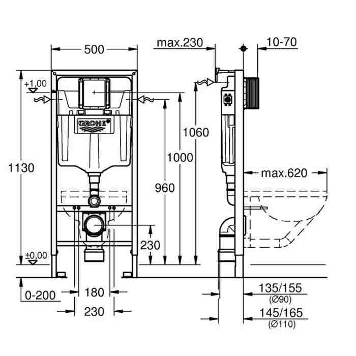 Комплектація бачок, інсталяційна система, коліно змиву 23 x 23 см, d 50/44 мм,
