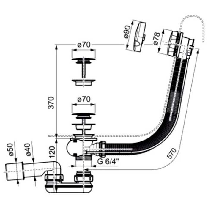 комплекти зливу для ванни із заповненням переливом довжиною 570 мм із регулятором зливу тросиком.