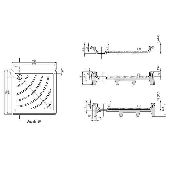 розміри: 90*90 см матеріал: LA - скловолокно тип LA: тип LA: для установки на ніжки (Base) або в підлогу глибина піддону: 9 см монтажна висота: 18,5 см діаметр сифону: 9 см гарантія: 2 роки Піддон Angela підходить для душових кабін SRV2-S+SRV2-S, ASRV3+ASRV3, BLRV2, SMSRV4, BSRV4, BSDPS і ванних кімнат з душовими дверима ASDP3, SDZ3, SDOP, PDOP1, SMSD2, BSD2.